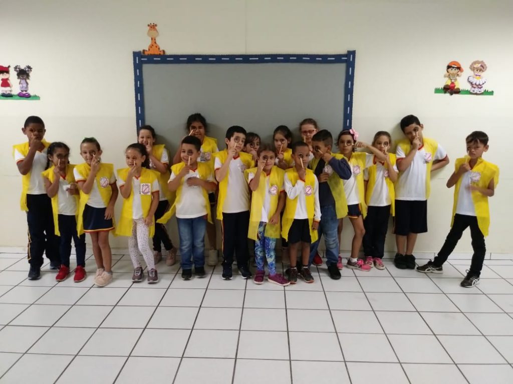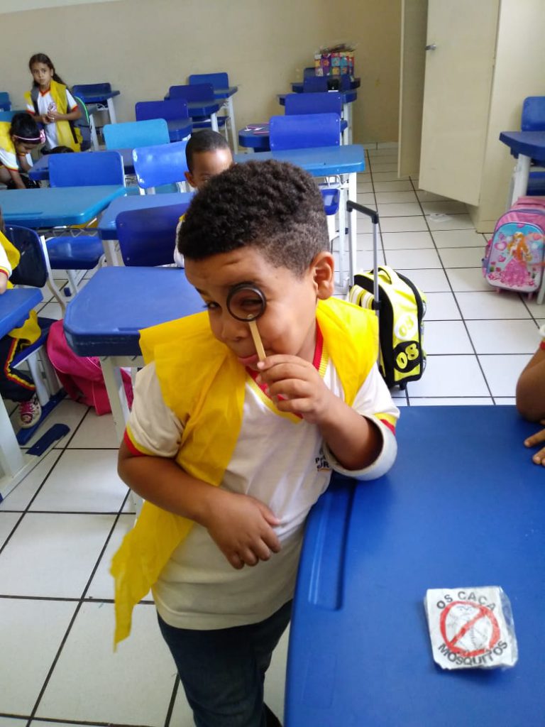 A professora da turma, Letícia Morales, aproveitou a semana de atividades e realizou uma brincadeira com as crianças. Os pequenos, que se vestiram a caráter de agentes de saúde, com direito a um jaleco amarelo e uma lupa confeccionada com material reutilizável (cápsulas de café), mostraram que aprenderam tudo sobre o trabalho de prevenção e realizaram um passeio pela escola e verificando se não havia água parada e focos da dengue.