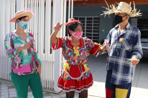 A caráter, o casal recebeu a pequena comitiva que foi levar a eles música, dança e alegria em celebração às festas desta época do ano, cheios de energia e descontração. Sem descuidar das normas de proteção contra a Covid-19, os namorados saíram à calçada e dançaram em roda numa referência à típica celebração interiorana que nasceu das tradições religiosas e lembram, em datas especificas do mês de junho, alguns santos católicos.