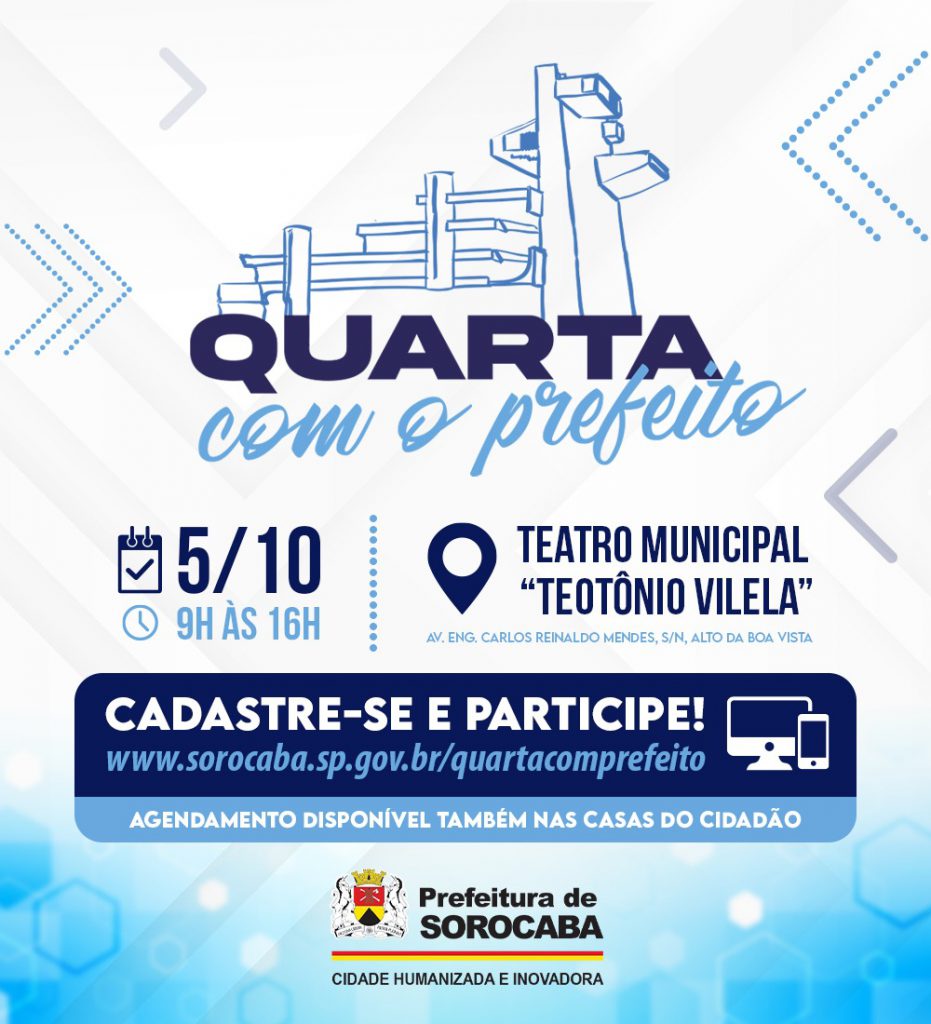 A Prefeitura de Sorocaba realizará, na próxima quarta-feira (5), das 9h às 16h, a 12ª edição do programa “Quarta com o Prefeito”, no Teatro Municipal “Teotônio Vilela” (TMTV), no Alto da Boa Vista.