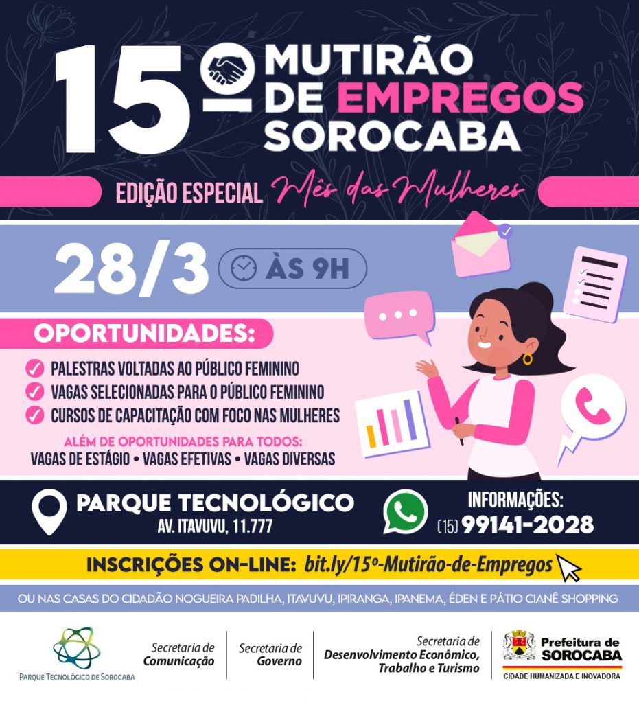 A Prefeitura de Sorocaba, por meio da Secretaria de Desenvolvimento, Trabalho e Turismo (Sedettur), com o apoio da Secretaria de Governo (Segov), Secretaria de Comunicação (Secom) e do Parque Tecnológico de Sorocaba (PTS), realizará, no dia 28 de março, às 9h, no PTS, a 15ª edição do Mutirão de Empregos Sorocaba, desta vez, com o tema especial “Mês da Mulher”.
