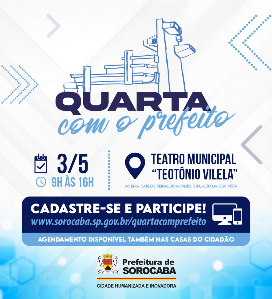 A Prefeitura de Sorocaba realizará, no dia 3 de maio (quarta-feira), das 9h às 16h, a 18ª edição do programa “Quarta com o Prefeito”, no Teatro Municipal “Teotônio Vilela” (TMTV), no Alto da Boa Vista.