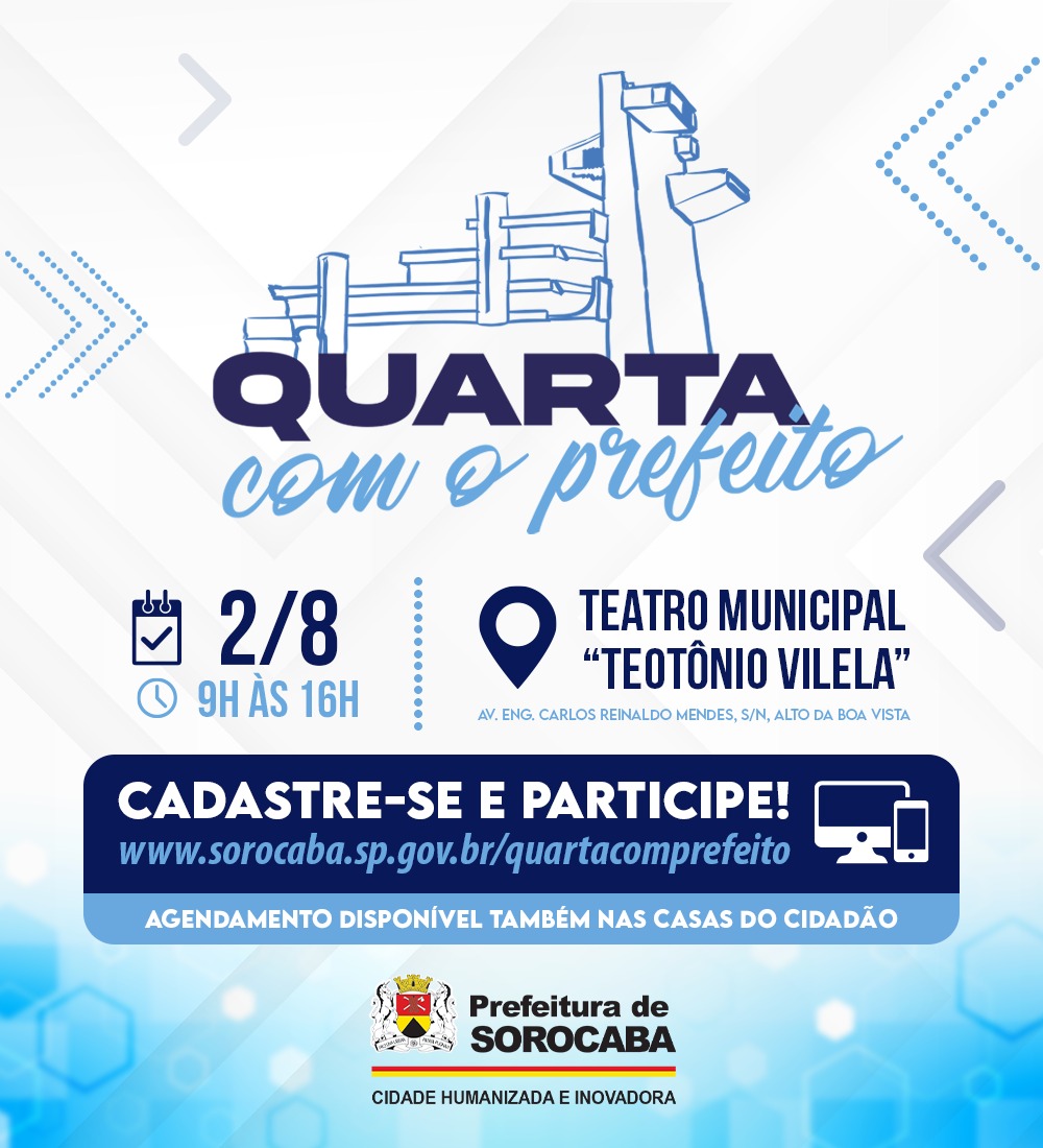 A iniciativa acontecerá no Teatro Municipal “Teotônio Vilela”, das 9h às 16h, e já estão disponíveis mais de 400 vagas de agendamento. O cadastro pode ser feito no site da Prefeitura de Sorocaba (http://www.sorocaba.sp.gov.br), acessando o banner do evento na página inicial ou diretamente pelo link: http://www.sorocaba.sp.gov.br/quartacomprefeito.