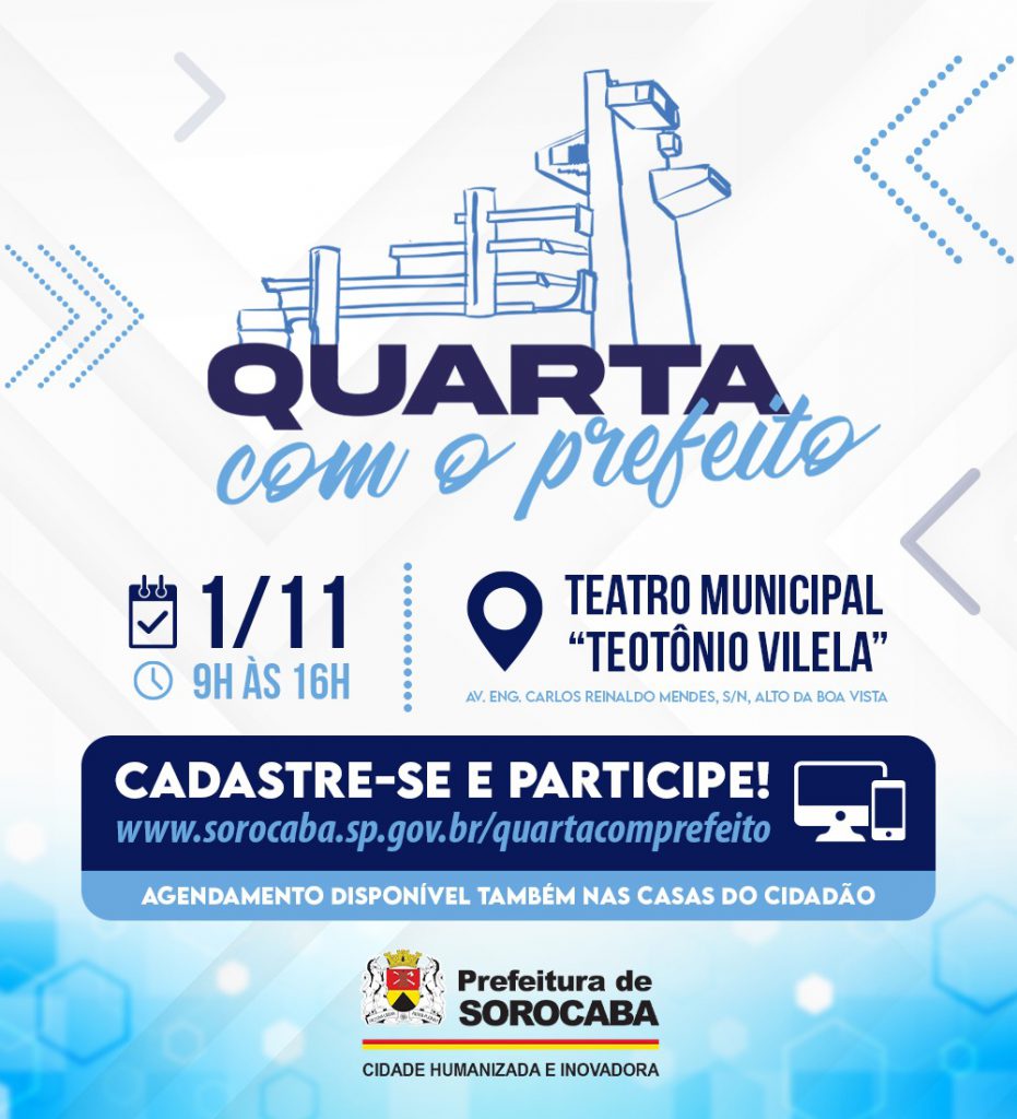 A Prefeitura de Sorocaba realizará, no dia 1 de novembro (quarta-feira), das 9h às 16h, a 24ª edição do programa “Quarta com o Prefeito”, no Teatro Municipal “Teotônio Vilela” (TMTV), no Alto da Boa Vista.