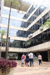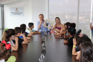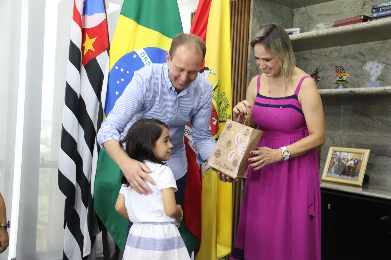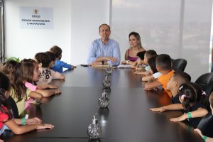 As visitas ao sexto andar do Paço Municipal, onde fica o Gabinete do Prefeito, foram organizadas em grupos. Prefeito e primeira-dama atenderam todas as crianças, contando sobre suas atribuições e o dia a dia em família.