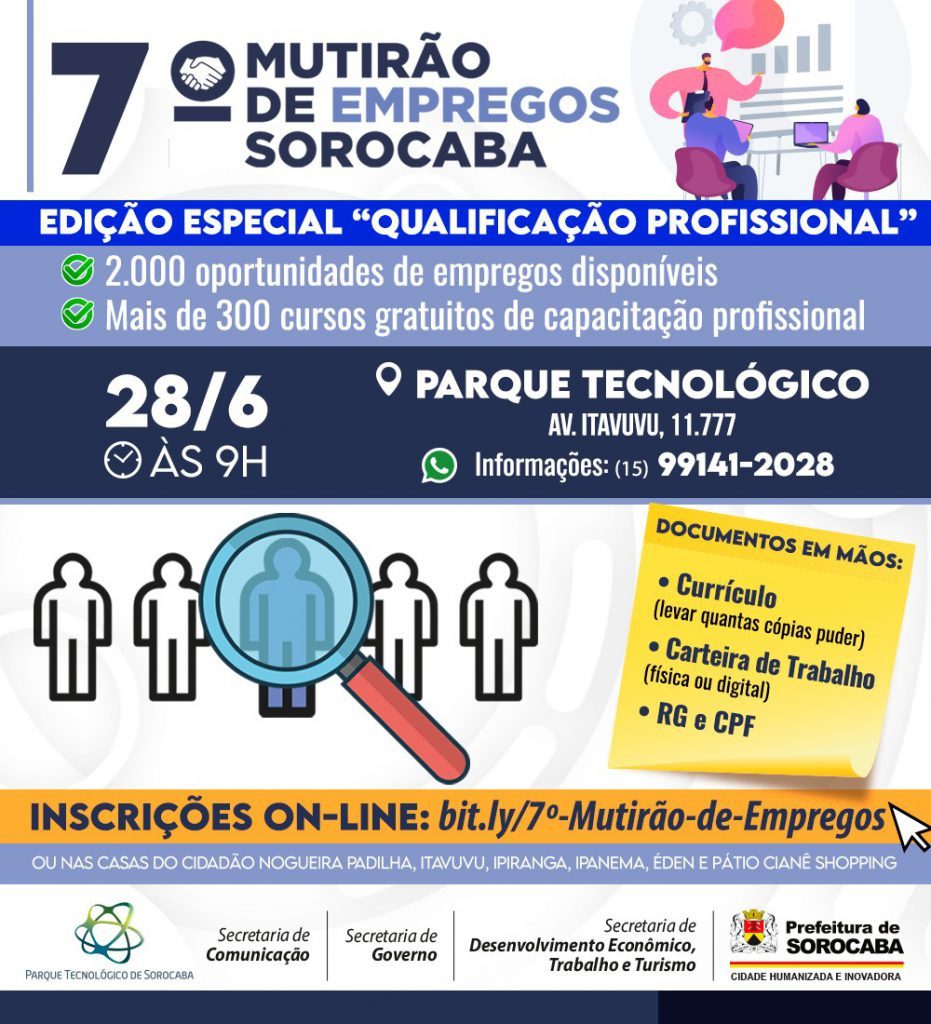7° Mutirão de Empregos Sorocaba edição especial “Qualificação Profissional” acontecerá na próxima terça-feira, dia 28 de junho, às 9h, no Parque Tecnológico. Com mais essas 1.000 vagas de agendamento disponíveis para candidatos a empregos, serão 2.000 vagas ofertadas no total. As inscrições podem ser feitas pelo link: https://www.sympla.com.br/evento/7-mutirao-de-empregos-sorocaba/1613377. Para os que preferirem, as inscrições também podem ser realizadas nas Casas do Cidadão Nogueira Padilha, Itavuvu, Ipiranga, Ipanema, Éden e Pátio Cianê Shopping.