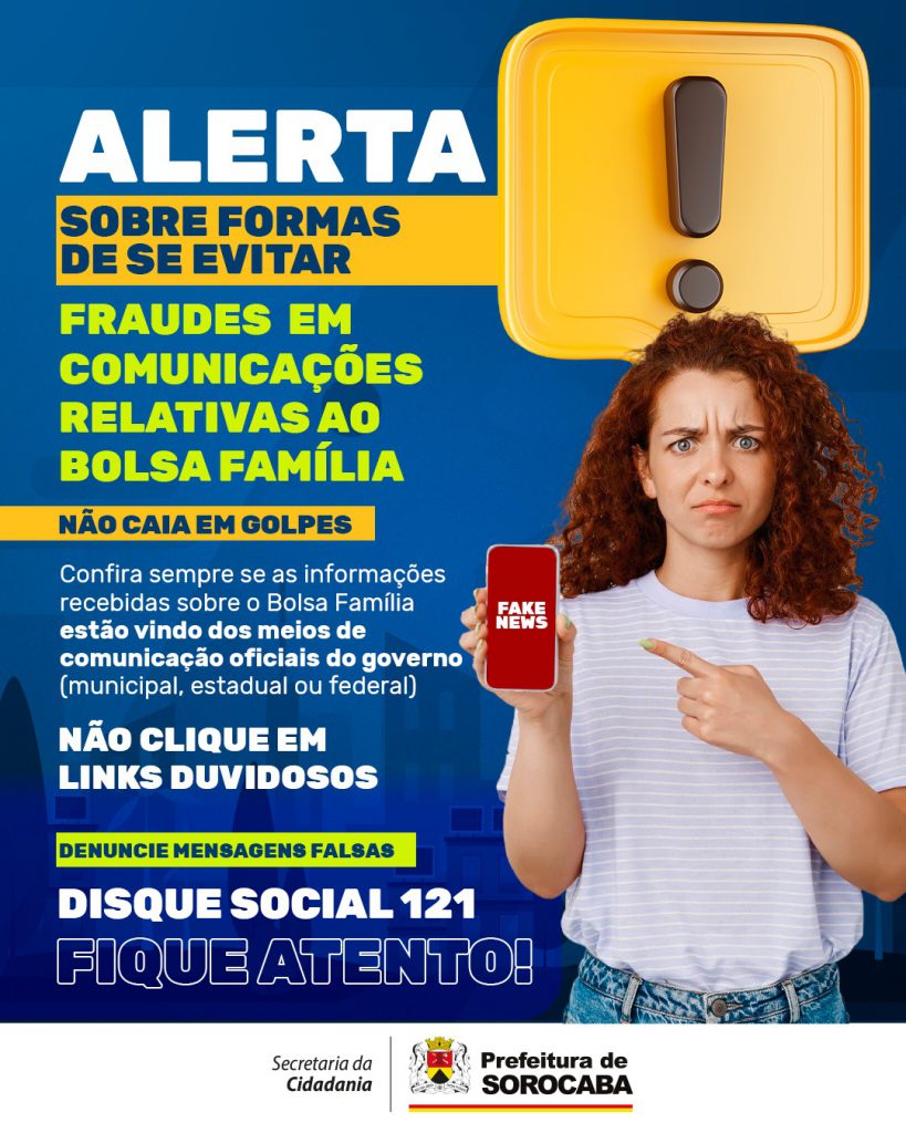 A Prefeitura de Sorocaba, por meio da Secretaria da Cidadania (Secid), divulga um alerta a todos os cidadãos, especialmente aos beneficiários do programa federal Bolsa Família, sobre formas de se evitar e prevenir a ocorrência de fraudes em comunicações relativas ao benefício.