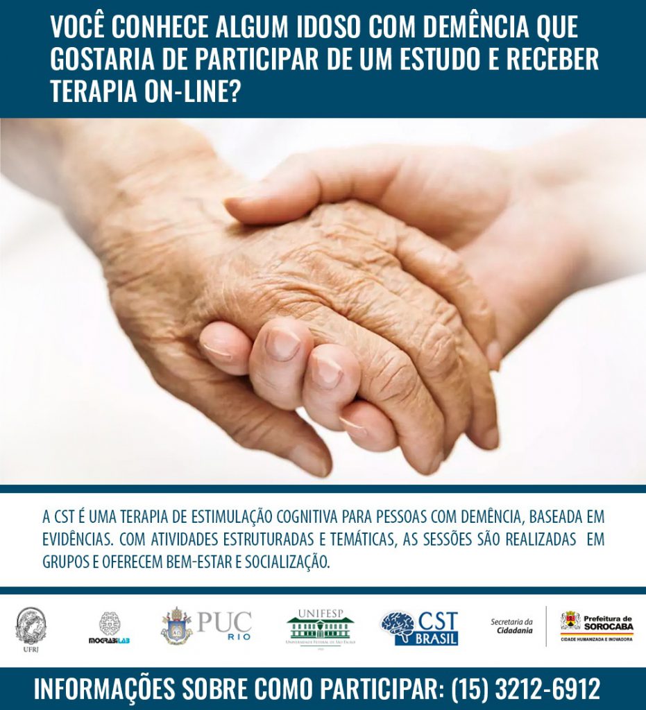 Uma iniciativa conduzida pela Puc-Rio (Pontifícia Universidade Católica), Universidade Federal de São Paulo (UNIFESP) e Universidade Federal do Rio de Janeiro (UFRJ), com apoio da Secretaria da Cidadania de Sorocaba (Secid), por meio da Coordenadoria do Idoso, oferece a oportunidade para que idosos com diagnóstico de demência participem de um estudo de implementação e tratamento da CST (Terapia de Estimulação Cognitiva, na sigla em inglês) no Brasil, que inclui recursos terapêuticos voltados ao controle da doença. A participação é voluntária, gratuita e on-line.