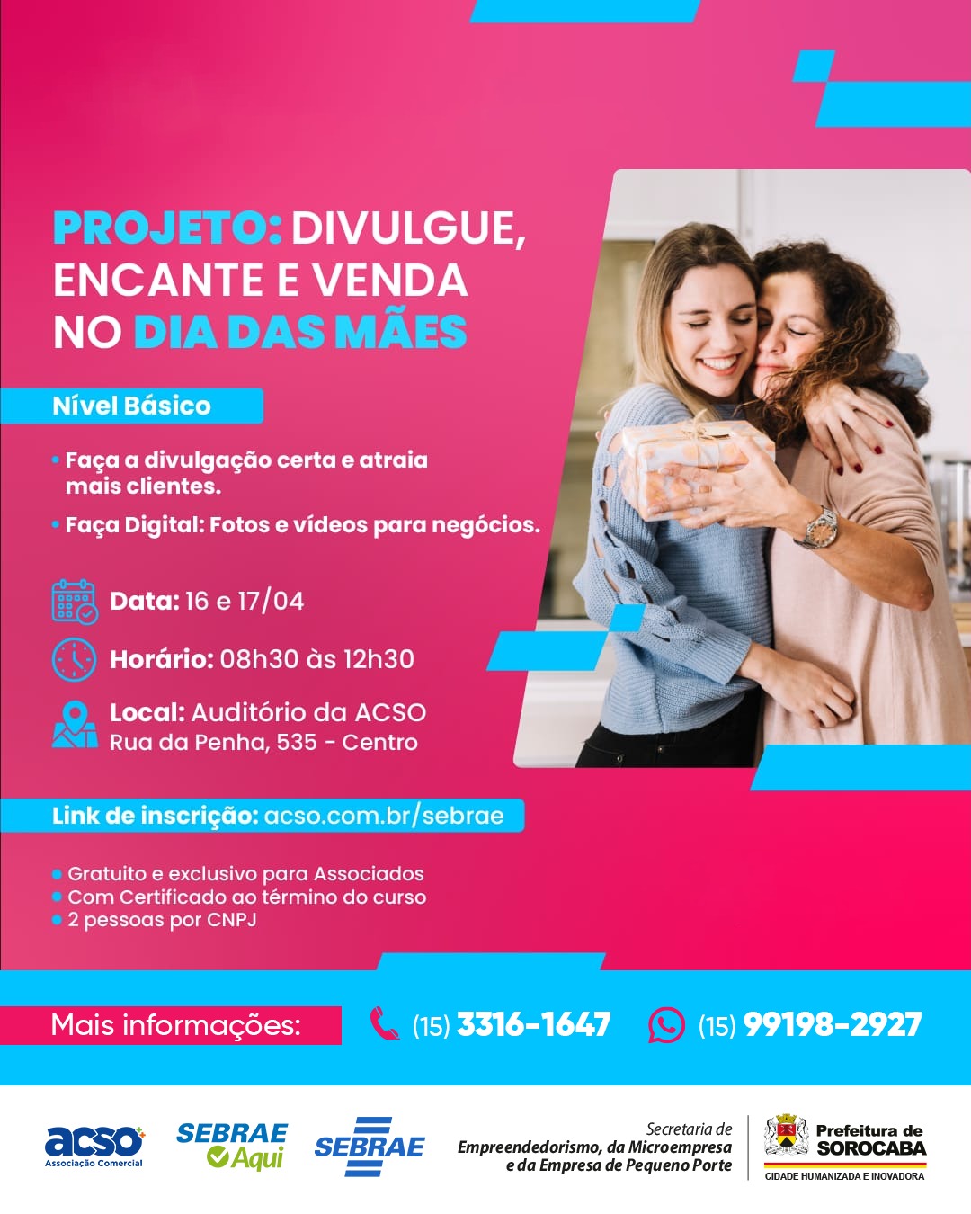 Destinado aos empreendedores de Sorocaba e região que desejam inovar em seus negócios no Dia das Mães, comemorado no dia 9 de maio, estão abertas as inscrições para o curso “Divulgue, Encante e Venda no Dia das Mães”. A capacitação ocorrerá 16 e 17 de abril (quinta e sexta-feira), das 8h30 às 12h30, no auditório da Associação Comercial de Sorocaba (ACSO), localizado no Centro da cidade.