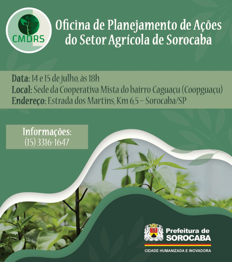 A Prefeitura de Sorocaba, por meio da Secretaria de Desenvolvimento Econômico, Trabalho e Turismo (Sedettur), em parceria com o Conselho Municipal de Desenvolvimento Rural Sustentável (CMDRS) e apoio do Serviço Brasileiro de Apoio às Micro e Pequenas Empresas (Sebrae), promove, nos dias 14 e 15 de julho, às 18h, na sede da Cooperativa Mista do bairro Caguaçu (Coopguaçu), a Oficina de Planejamento de Ações do Setor Agrícola de Sorocaba.