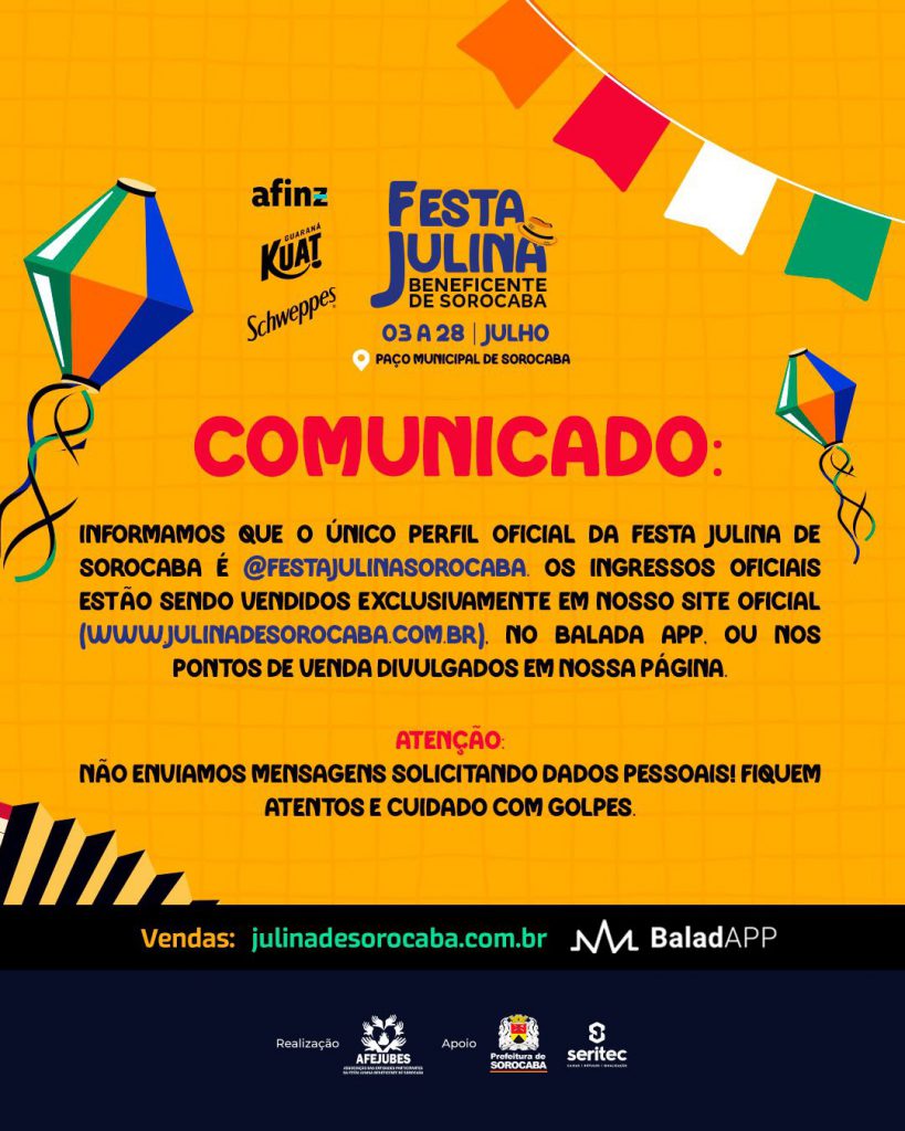 A Associação das Entidades Participantes da Festa Junina Beneficente de Sorocaba (Afejubes) e a Prefeitura de Sorocaba alertam a população para tentativas de golpe utilizando uma conta falsa da 43ª Festa Julina Beneficente de Sorocaba – Arraiá da Família, no Instagram.