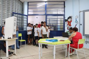 A votação para o Grêmio Estudantil segue o modelo utilizado pelos adultos e, para tornar a experiência mais interessante, o cartório eleitoral disponibilizou uma cabina de votação para as eleições. “Estou adorando participar porque será muito bom pra nossa escola. A chapa que escolhi é de um colega da minha sala, eles disseram que se ganharem vão pedir mais uma rede de vôlei, por isso decidi meu voto”, contou Ana Júlia Almeida, aluna do 5º ano, que aguardava ansiosa na fila para votação.