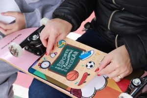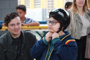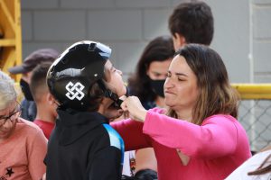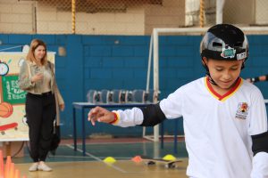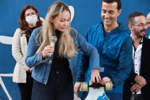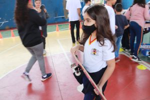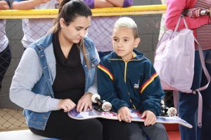 Outra convidada foi a diretora do CEI-48 Frei Achilles Kloeckner, Patrícia Helena F. de Campos Zamboni. Ela começou a praticar o skate durante a pandemia e se envolveu com a atividade. “Comecei a aprender com minha filha, porque a acompanhava na atividade e achei que poderia fazer também. Cheguei a levar alguns tombos, mas isso não me desanimou. Por isso, vejo também a importância de usar os equipamentos de segurança, exatamente como estão oferecendo, aqui, aos alunos”, pontuou.