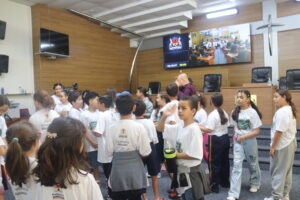 Participaram estudantes do 3º ao 5º ano, com idades que variam entre 8 e 11 anos. Além de lotar as mesas dispostas no saguão “Salvadora Lopes”, que dá acesso à Câmara, eles conheceram suas dependências, entre as quais podemos destacar o Plenário, os gabinetes dos vereadores, a sala da Presidência e também a área de Comunicação, onde está localizada a Rádio Câmera.