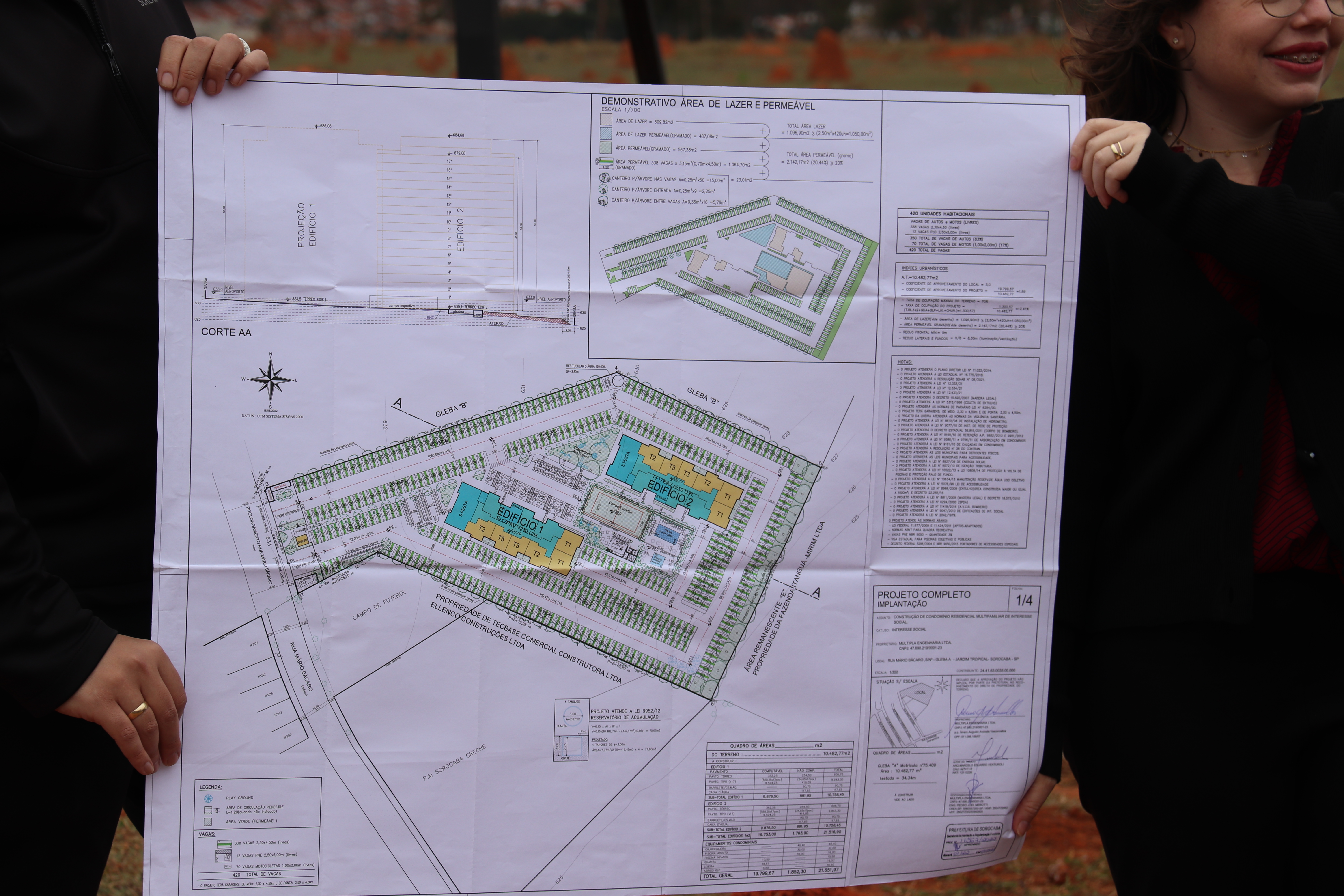 Na ocasião, também foi entregue o projeto aprovado e a matrícula retificada em cartório, documentos necessários para que a empresa registre a incorporação imobiliária. Também estavam presentes o secretário do Meio Ambiente, Proteção e Bem-Estar Animal (Sema), Thiago Santoro, o ouvidor-geral do Município, Evandro Bueno, além de servidores municipais e outros três representantes da construtora, o diretor de Obras, Pedro Joel Nerotti, o coordenador de Projetos e Orçamentos, Murilo Denardi, e o coordenador de Obras, Gustavo Borges.