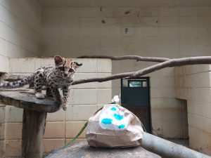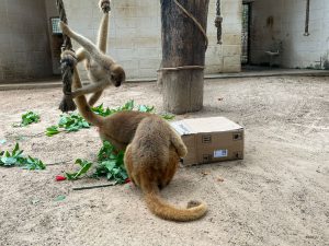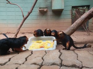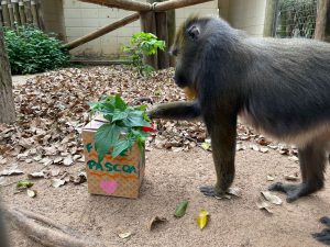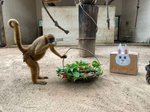 O muriqui-do-sul ganhou uma cesta confeccionada com cipó e hibisco, contendo cenoura e ovos cozidos, além de uma caixa de papelão, com um coelhinho desenhado, com hibisco e ração para primatas. O mico-leão-de-cara-dourada e o bugio-preto ganharam sorvetes de manga em formato de coelhinho. Já, o urso-de-óculos recebeu um enriquecimento ambiental sensorial, com um saquinho de papelão enfeitado, onde foram colocados galhinhos de hibisco com canela.