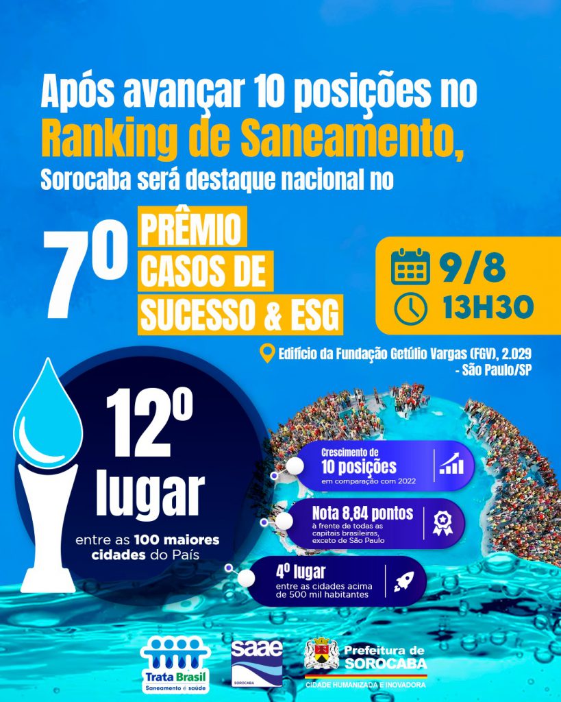 Após avançar dez posições no ranking de Saneamento, Sorocaba será destaque nacional no 7º Prêmio Casos de Sucesso & ESG no dia 9 em São Paulo