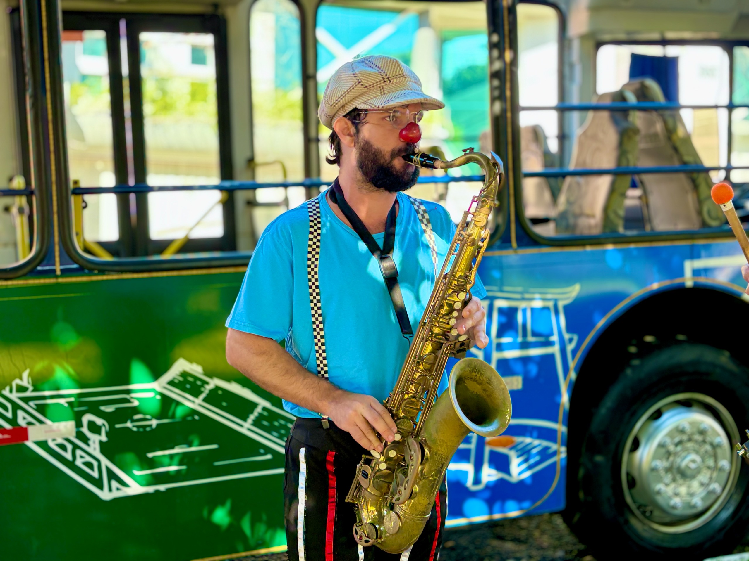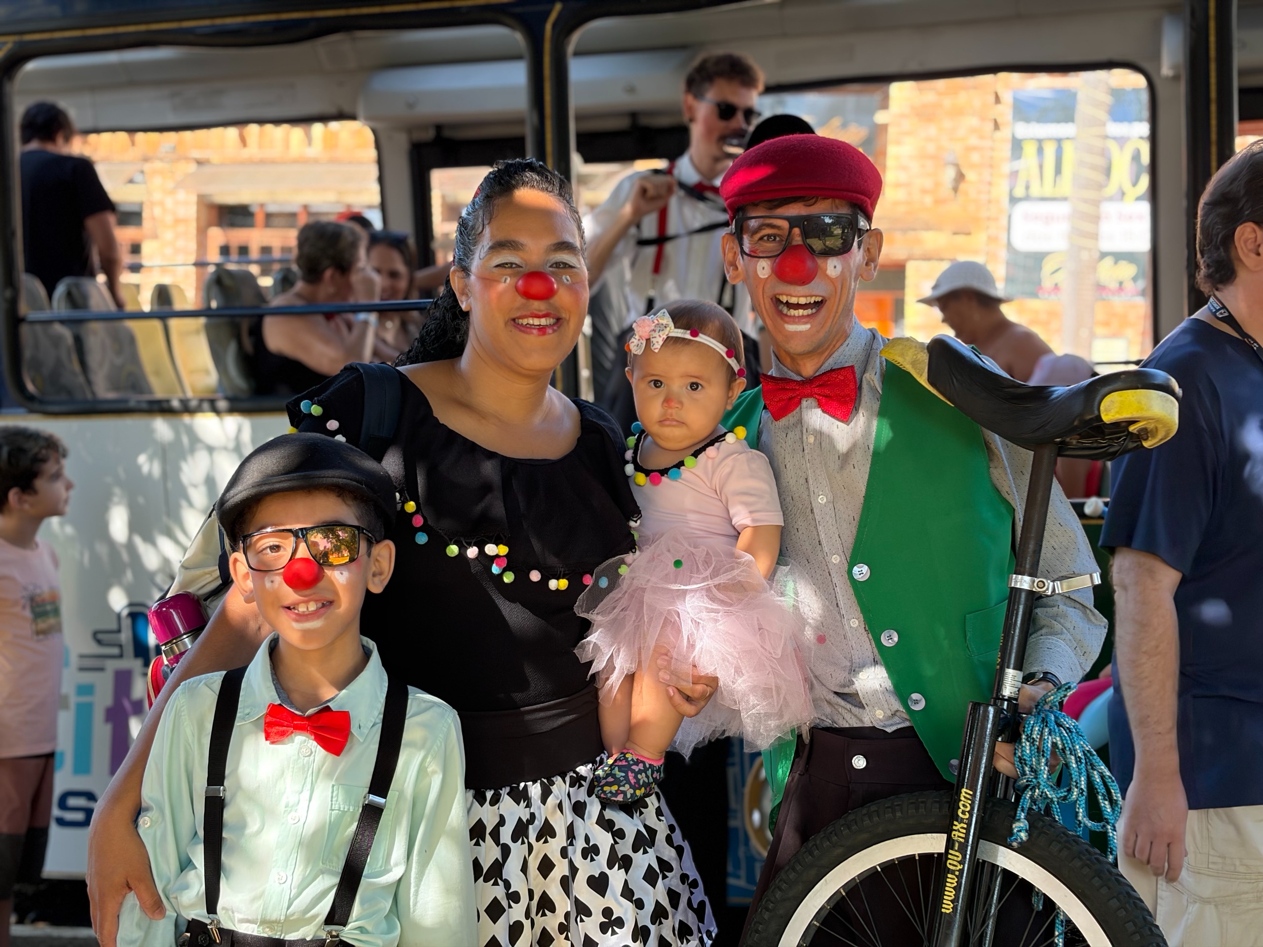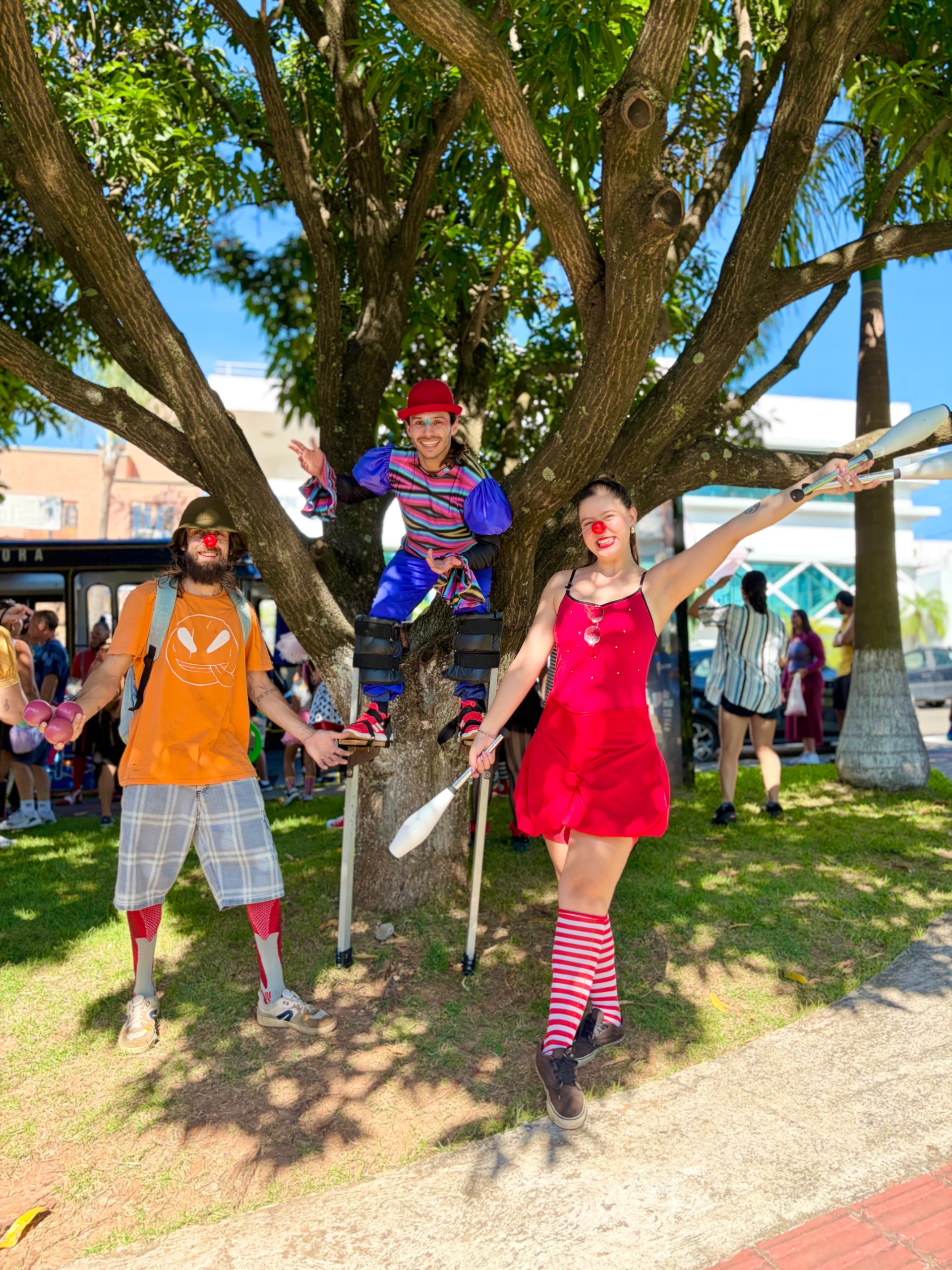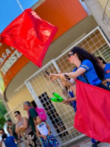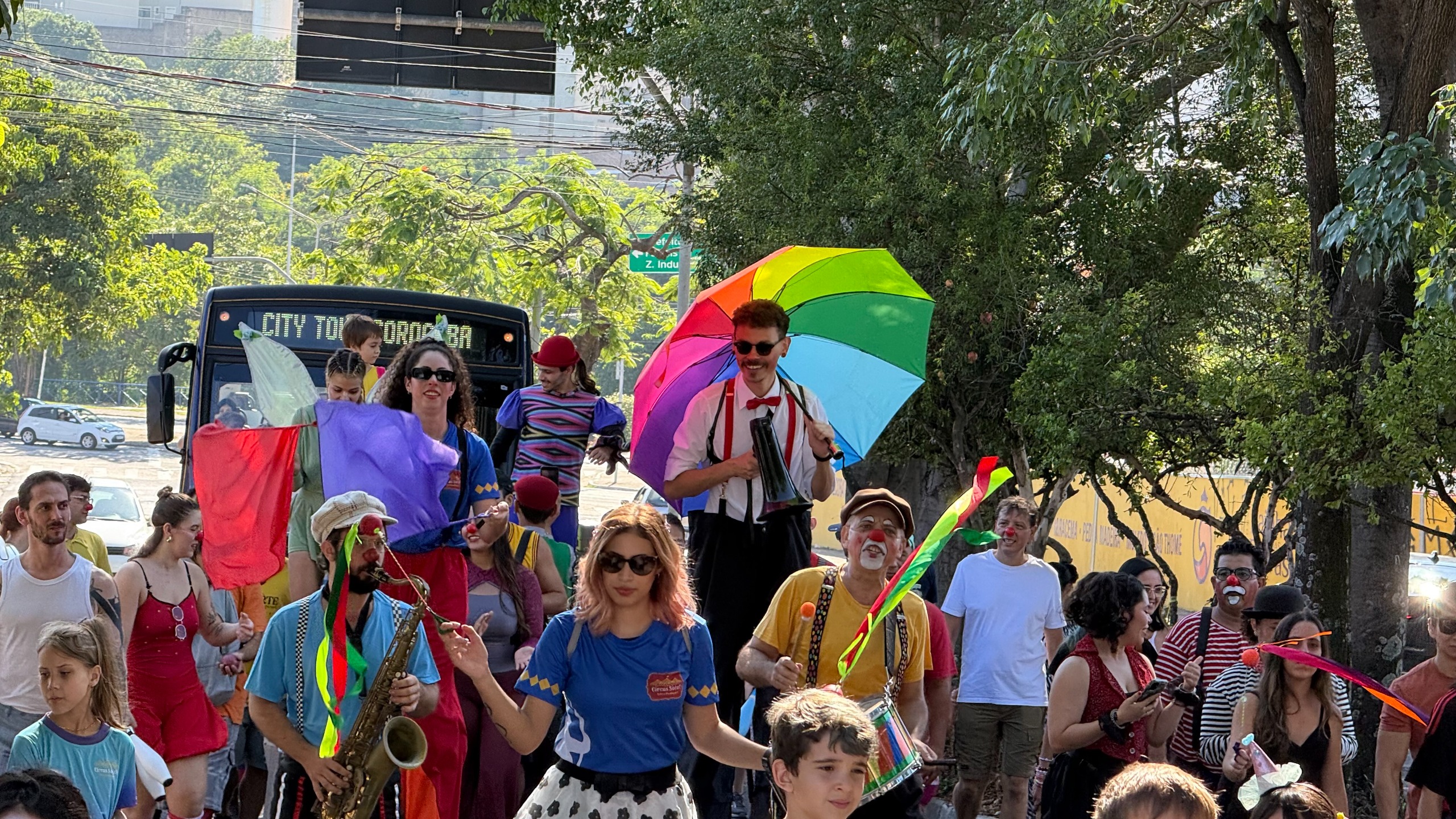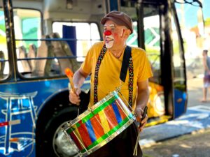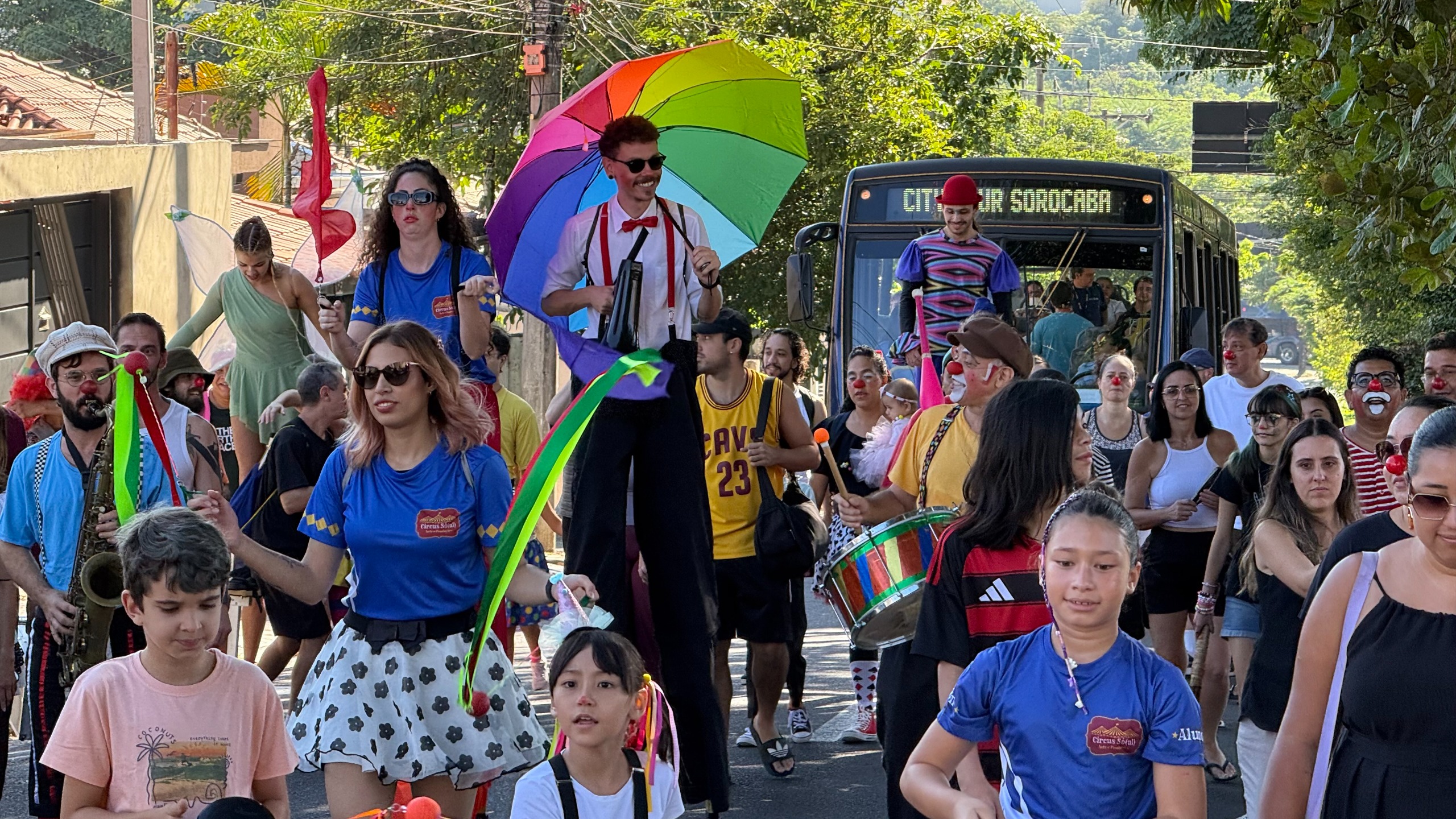 Chegando ao destino, os artistas transformaram o espaço público em um verdadeiro palco a céu aberto, promovendo uma festa animada e repleta de intervenções culturais, idealizada pela escola de circo Usinarte.