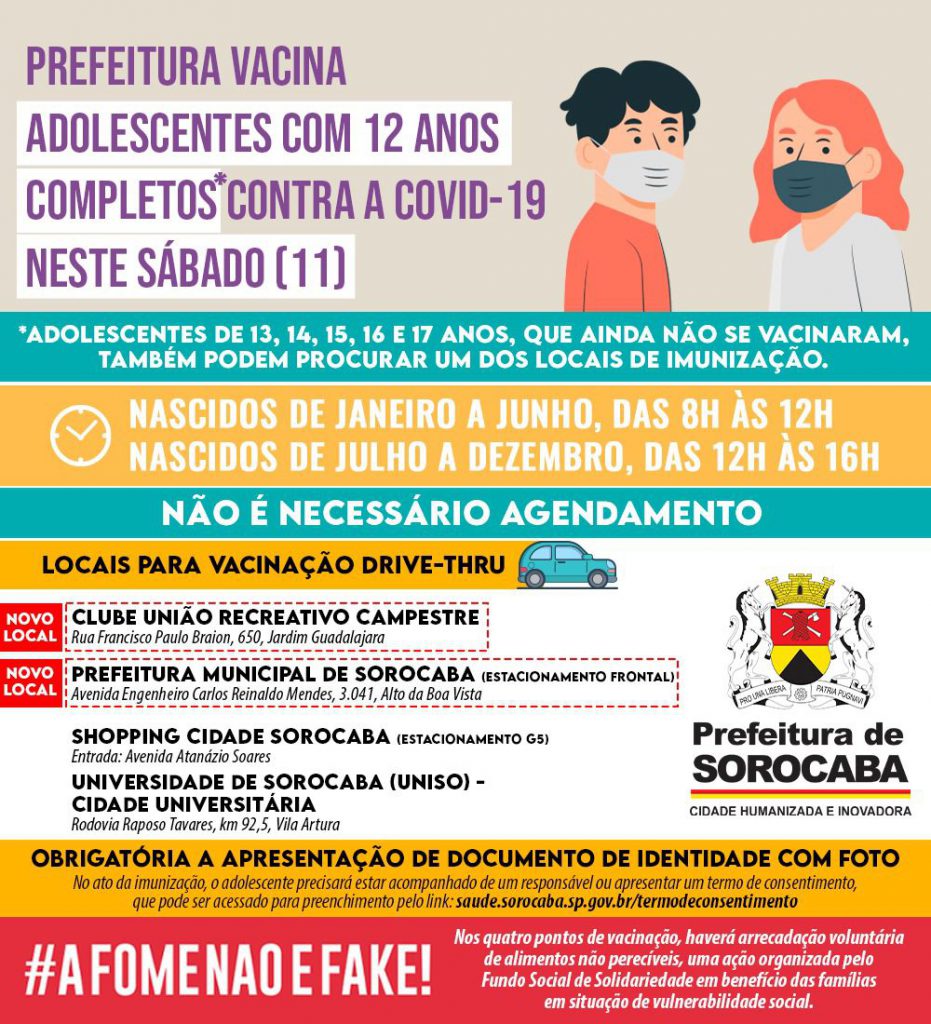 Neste sábado (11), a Prefeitura de Sorocaba, por meio da Secretaria da Saúde (SES), realizará a imunização da primeira dose da vacina contra a Covid-19 em pessoas de 12 anos completos. Adolescentes de 13, 14, 15, 16 e 17 anos, que ainda não se vacinaram, também podem procurar um dos locais de imunização. A ação ocorrerá, por sistema drive-thru, em quatro pontos da cidade, e não é necessário agendamento.