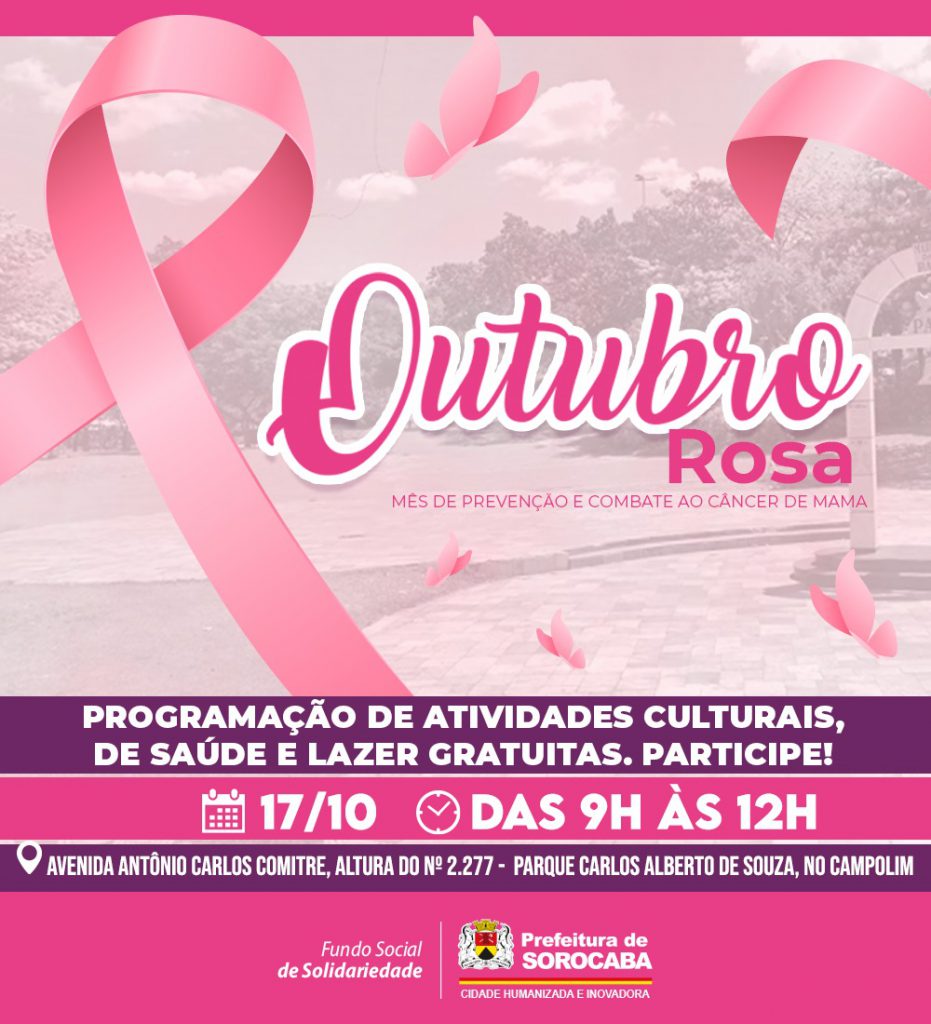 A Prefeitura de Sorocaba, por meio do Fundo Social de Solidariedade (FSS), organizou um grande evento, com várias atividades gratuitas, para destacar à população o Outubro Rosa, mês dedicado às ações de conscientização sobre a prevenção e o combate ao câncer de mama. O evento será realizado neste domingo (17), das 9h às 12h, no Parque “Carlos Alberto de Souza”, no Campolim.