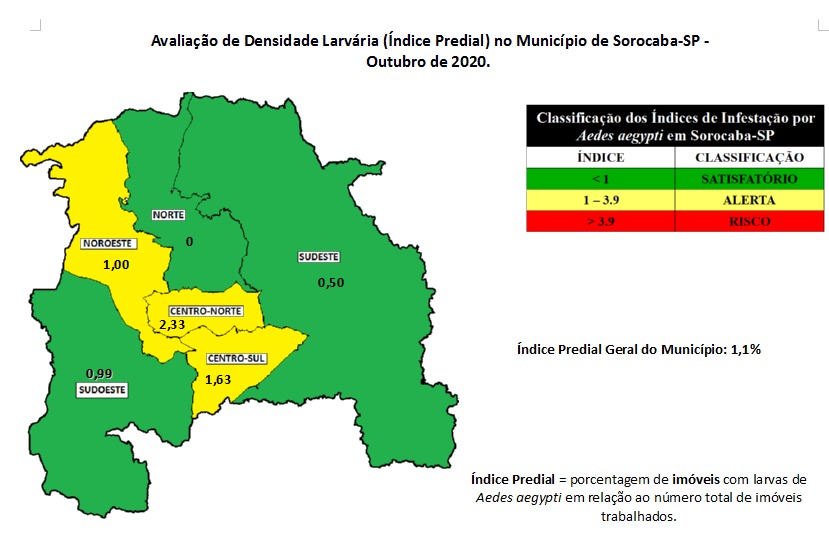 De acordo com a Zoonoses, a cada 100 imóveis trabalhados, 1,1 tinham larvas do mosquito. Os índices são classificados entre satisfatório (até 1%), alerta (acima de 1% até 3,9%) e risco (acima de 3,9%). Devido à pandemia da Covid-19, a busca pelas larvas ocorreu apenas nas áreas externas dos imóveis, por motivos de segurança dos servidores e dos munícipes, conforme orientações do Ministério da Saúde. Portanto, os índices encontrados provavelmente seriam maiores se a vistoria fosse completa nos imóveis.