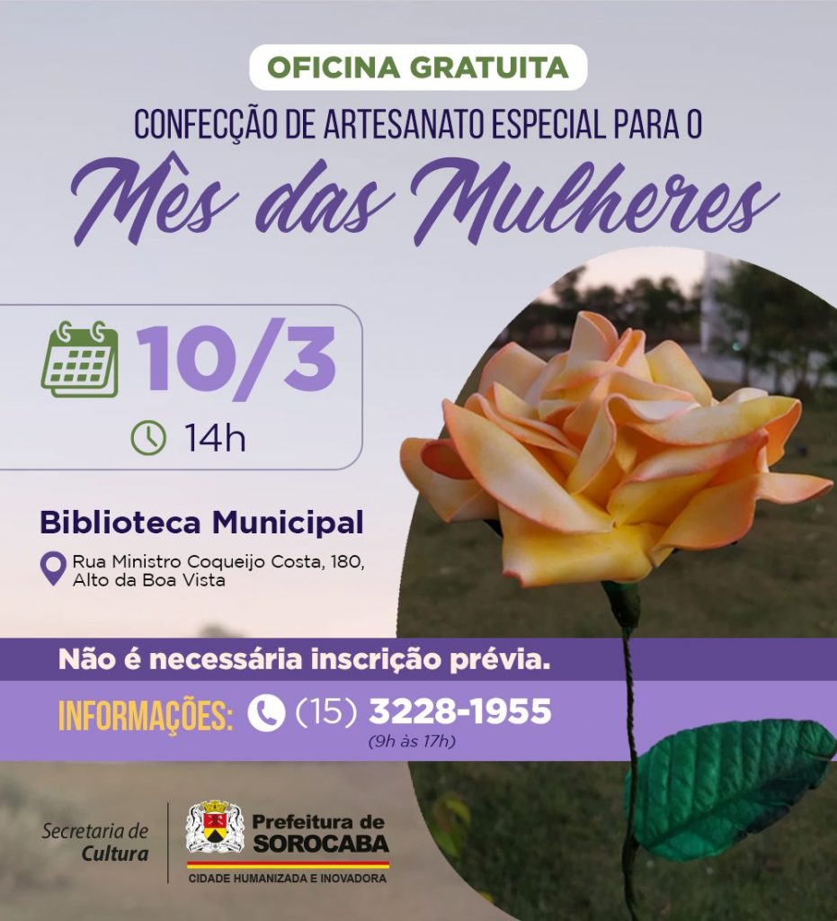 A Prefeitura de Sorocaba, por meio da Secretaria de Cultura (Secult), promove, nesta sexta-feira (10), uma oficina gratuita voltada à confecção de artesanato, que poderá se tornar um belo presente exclusivo para o Mês das Mulheres, cujo dia oficial é celebrado em 8 de março. Os participantes aprenderão a fazer rosas em EVA, durante a atividade que será realizada na Biblioteca Municipal “Jorge Guilherme Senger”, a partir das 14h.