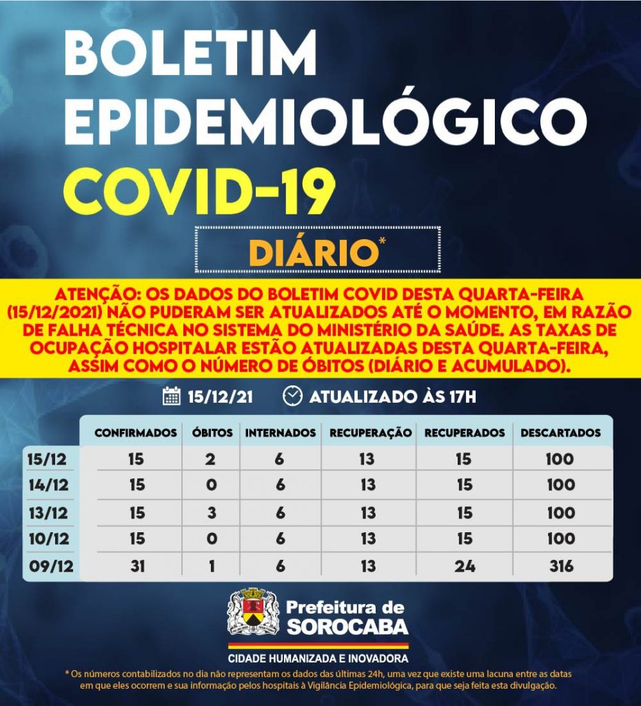 Atenção: os dados do Boletim Covid desta quarta-feira (15/12/2021) não puderam ser atualizados até o momento, em razão de falha técnica no sistema do Ministério da Saúde. As taxas de ocupação hospitalar estão atualizadas desta quarta-feira, assim como o número de óbitos (diário e acumulado).