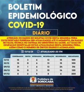 Atenção: os dados do Boletim Covid desta segunda-feira (13/12/2021) não puderam ser atualizados até o momento, em razão de falha técnica no sistema do Ministério da Saúde. As taxas de ocupação hospitalar estão atualizadas desta segunda-feira, assim como o número de óbitos (diário e acumulado).