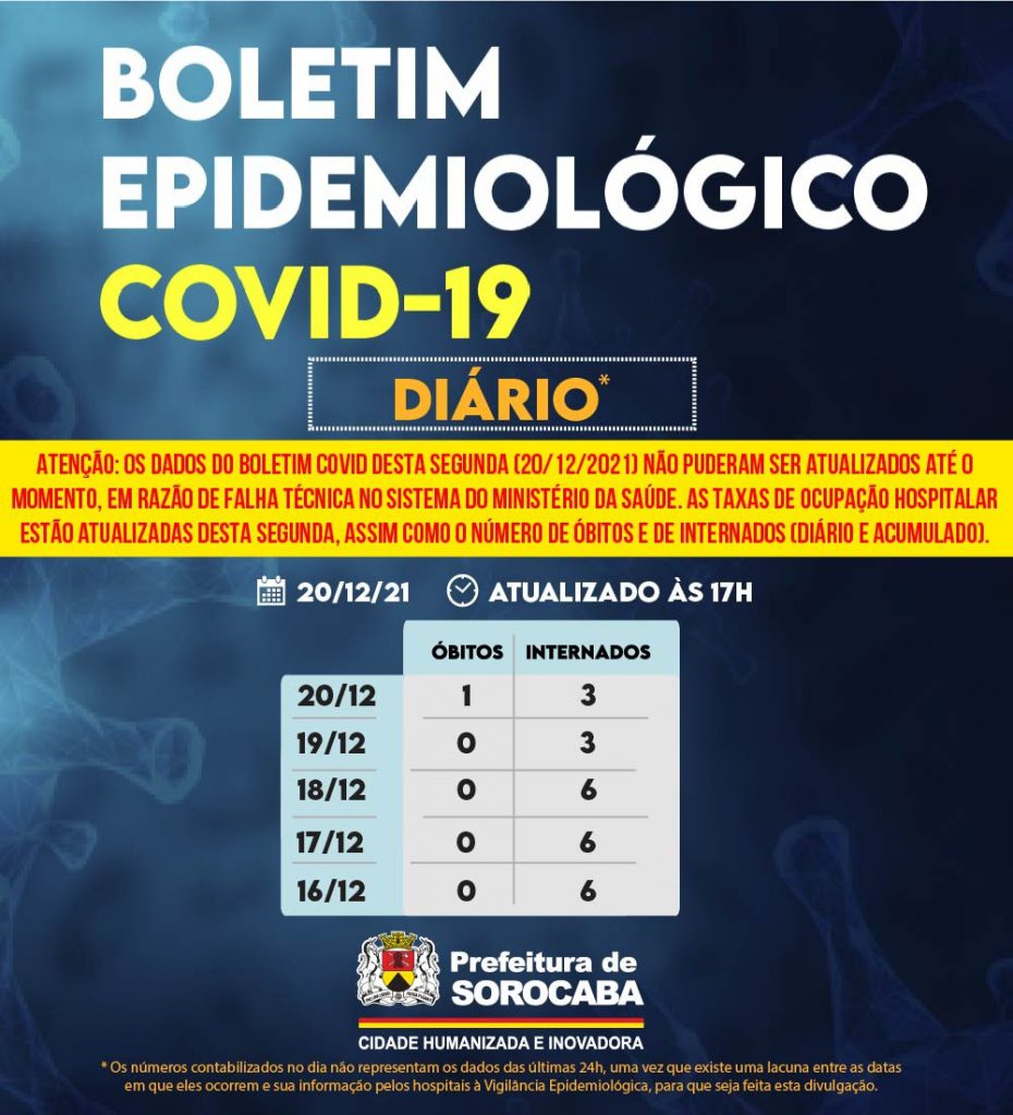 Atenção: os dados do Boletim Covid desta segunda-feira (20/12/2021) não puderam ser atualizados até o momento, em razão de falha técnica no sistema do Ministério da Saúde. As taxas de ocupação hospitalar estão atualizadas desta segunda-feira, assim como o número de óbitos e de internados (diário e acumulado).