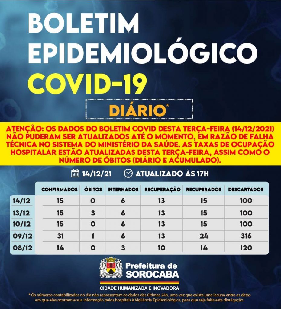 Atenção: os dados do Boletim Covid desta terça-feira (14/12/2021) não puderam ser atualizados até o momento, em razão de falha técnica no sistema do Ministério da Saúde. As taxas de ocupação hospitalar estão atualizadas desta terça-feira, assim como o número de óbitos (diário e acumulado).