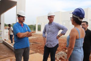 A segunda parada das equipes da Prefeitura foi na Rua Alcino Oliveira Rosa, onde está sendo construído um Centro de Educação Infantil (CEI), que vai atender 188 crianças do Parque São Bento e bairros adjacentes. O método de construção estrutural é com base em perfis de PVC e essa nova unidade de ensino terá 10 salas de aula.