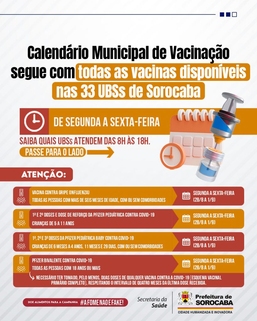 O Calendário Municipal de Vacinação segue atendendo a população com todas as vacinas disponíveis, de segunda a sexta-feira, em horário estendido, das 8h às 18h, em 19 Unidades Básicas de Saúde (UBSs) da cidade. São elas: Aparecidinha, Brigadeiro Tobias, Carandá, Cerrado, Éden, Fiori, Habiteto, Haro, Hortência, Laranjeiras, Lopes de Oliveira, Márcia Mendes, Mineirão, Nova Sorocaba, São Bento, São Guilherme, Simus, Sorocaba 1 e Vitória Régia. As demais UBSs continuam atendendo normalmente, das 8h às 16h, de segunda a sexta-feira.