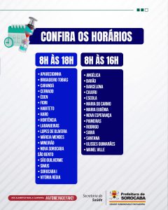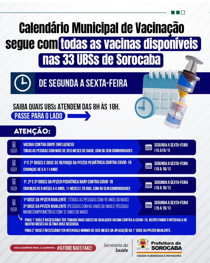 O Calendário Municipal de Vacinação segue atendendo a população, na semana de 15 a 19/1, com todas as vacinas disponíveis, exceto contra varicela, que aguarda envio do Ministério da Saúde, em horário estendido, das 8h às 18h, em 19 Unidades Básicas de Saúde (UBSs) da cidade. São elas: Aparecidinha, Brigadeiro Tobias, Carandá, Cerrado, Éden, Fiori, Habiteto, Haro, Hortência, Laranjeiras, Lopes de Oliveira, Márcia Mendes, Mineirão, Nova Sorocaba, São Bento, São Guilherme, Simus, Sorocaba 1 e Vitória Régia. As demais UBSs continuam atendendo normalmente, das 8h às 16h.