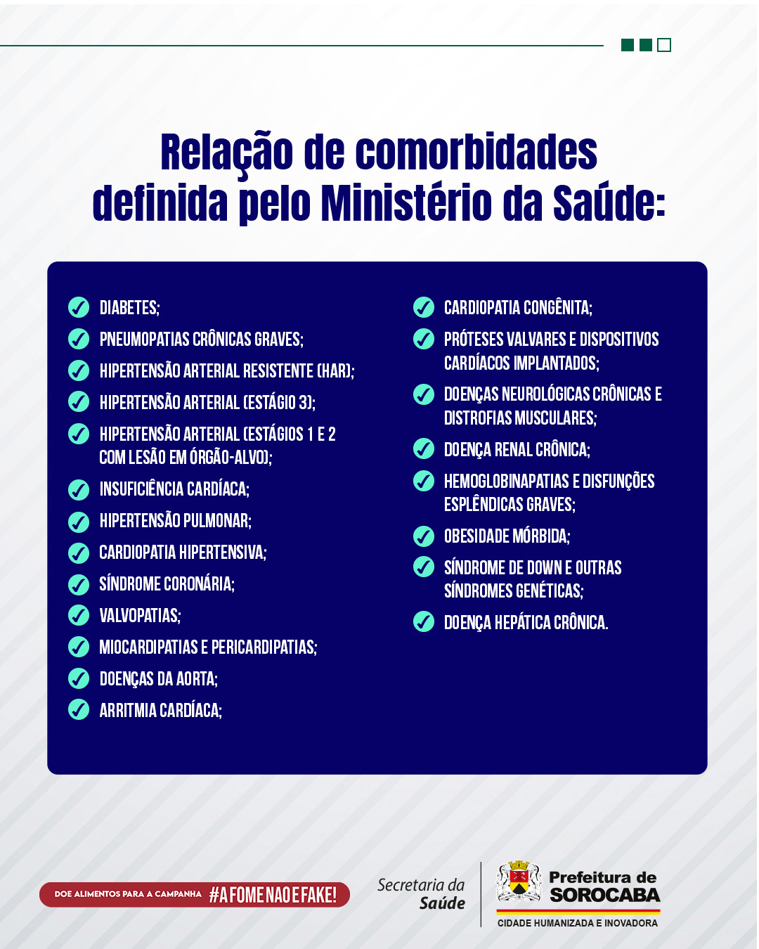 Já as vacinas contra a gripe (Influenza) contemplam todas as pessoas com mais de seis meses de idade, com ou sem comorbidades. As vacinas Pfizer Baby, Pfizer Pediátrica e Pfizer Adulto igualmente são fornecidas aos respectivos públicos-alvo, em todas as UBSs.
