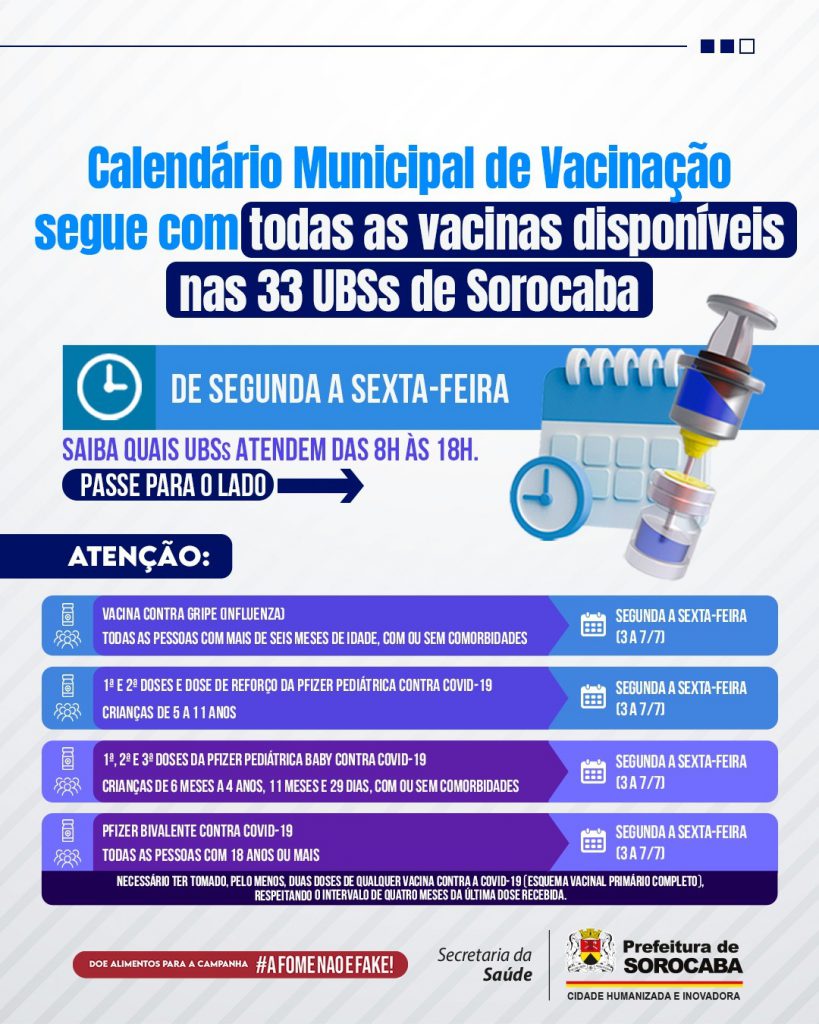 O Calendário Municipal de Vacinação segue atendendo a população com todas as vacinas disponíveis, de segunda a sexta-feira, em horário estendido, das 8h às 18h, em 19 Unidades Básicas de Saúde (UBSs) da cidade. São elas: Aparecidinha, Brigadeiro Tobias, Carandá, Cerrado, Éden, Fiori, Habiteto, Haro, Hortência, Laranjeiras, Lopes de Oliveira, Márcia Mendes, Mineirão, Nova Sorocaba, São Bento, São Guilherme, Simus, Sorocaba 1 e Vitória Régia. As demais UBSs continuam atendendo normalmente, das 8h às 16h, de segunda a sexta-feira.