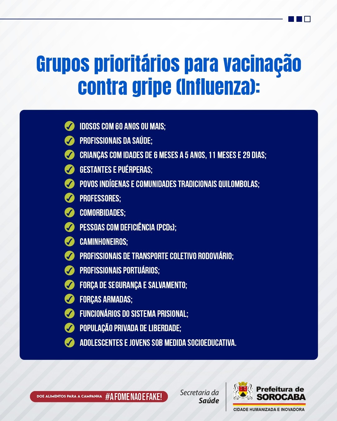 Já, as vacinas contra a gripe (Influenza) contemplam todas as pessoas com mais de seis meses de idade, com ou sem comorbidades.