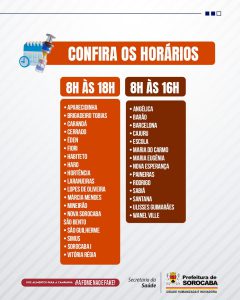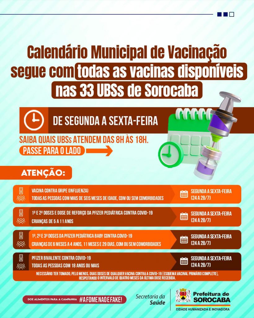 O Calendário Municipal de Vacinação segue atendendo a população com todas as vacinas disponíveis, de segunda a sexta-feira, em horário estendido, das 8h às 18h, em 19 Unidades Básicas de Saúde (UBSs) da cidade. São elas: Aparecidinha, Brigadeiro Tobias, Carandá, Cerrado, Éden, Fiori, Habiteto, Haro, Hortência, Laranjeiras, Lopes de Oliveira, Márcia Mendes, Mineirão, Nova Sorocaba, São Bento, São Guilherme, Simus, Sorocaba 1 e Vitória Régia. As demais UBSs continuam atendendo normalmente, das 8h às 16h, de segunda a sexta-feira.