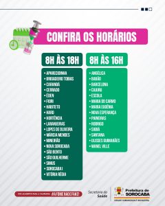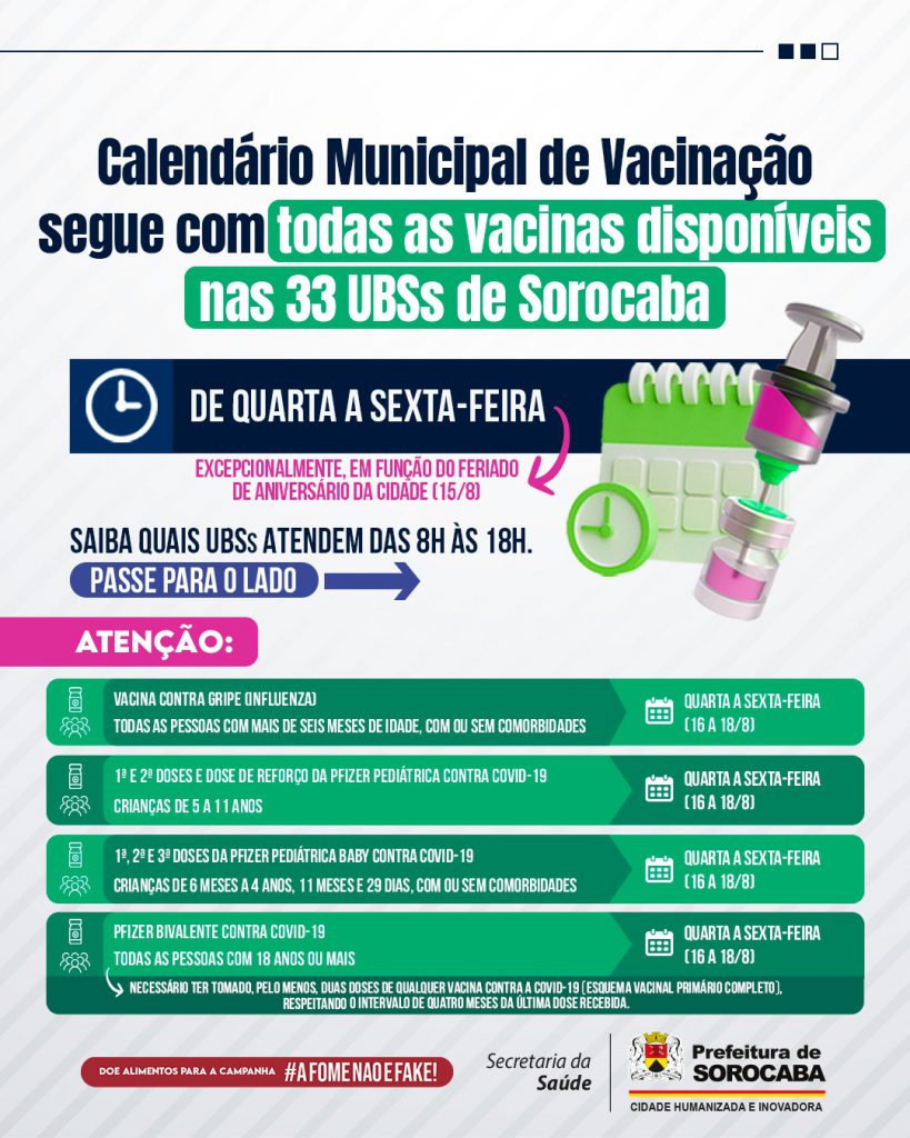 O Calendário Municipal de Vacinação segue atendendo a população com todas as vacinas disponíveis em horário estendido, das 8h às 18h, em 19 Unidades Básicas de Saúde (UBSs) da cidade. São elas: Aparecidinha, Brigadeiro Tobias, Carandá, Cerrado, Éden, Fiori, Habiteto, Haro, Hortência, Laranjeiras, Lopes de Oliveira, Márcia Mendes, Mineirão, Nova Sorocaba, São Bento, São Guilherme, Simus, Sorocaba 1 e Vitória Régia. As demais UBSs continuam atendendo normalmente, das 8h às 16h. Em função do feriado do Aniversário de Sorocaba (15), a vacinação acontecerá, excepcionalmente, de quarta (16) a sexta-feira (18).