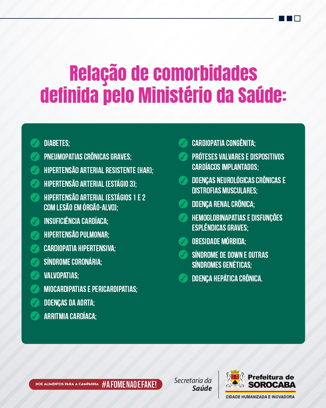 Já, as vacinas contra a gripe (Influenza) contemplam todas as pessoas com mais de seis meses de idade, com ou sem comorbidades. As vacinas Pfizer Baby, Pfizer Pediátrica e Pfizer Adulto igualmente são fornecidas aos respectivos públicos-alvo, em todas as UBSs.
