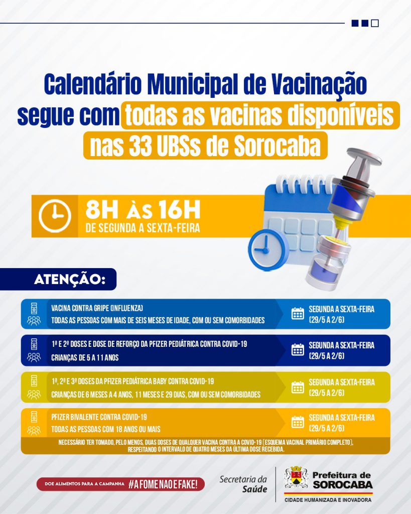 O Calendário Municipal de Vacinação segue atendendo a população com todas as vacinas disponíveis, nas 33 UBSs (Unidades Básicas de Saúde) da cidade de Sorocaba, de segunda a sexta-feira, das 8h às 16h, na semana de 29/5 a 2/6.