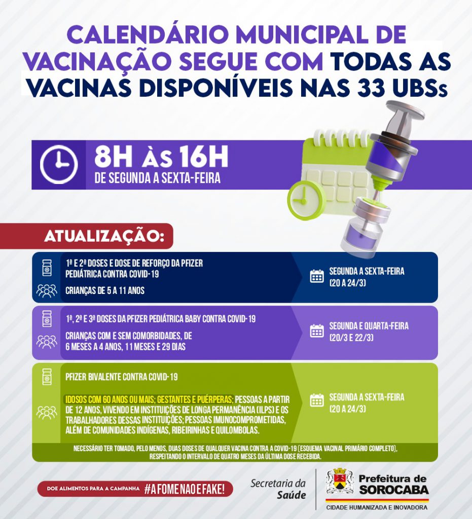 O Calendário Municipal de Vacinação segue atendendo a população com todas as vacinas disponíveis, nas 33 UBSs (Unidades Básicas de Saúde) da cidade de Sorocaba, das 8h às 16h.