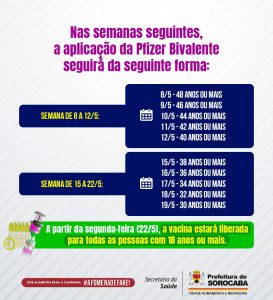 Na segunda-feira (15/5), serão aplicadas vacinas Pfizer Bivalente nas pessoas com 38 anos ou mais; na terça-feira (16/5), 36 anos ou mais; na quarta-feira (17/5), para 34 anos ou mais; na quinta-feira (18/5), 32 anos ou mais e na sexta-feira (19/5), para 30 anos ou mais. A partir da segunda-feira (22/5), a vacina estará liberada para todas as pessoas com 18 anos ou mais.
