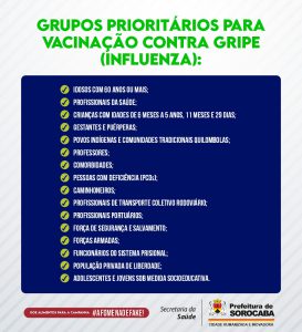 Já, as vacinas contra a gripe (Influenza), para idosos com 60 anos ou mais; profissionais da Saúde; crianças de seis meses a 5 anos, 11 meses e 29 dias; gestantes e puérperas; além de outras pessoas dos grupos prioritários (confira lista, em anexo) serão aplicadas ao longo da semana (2 a 5/5).