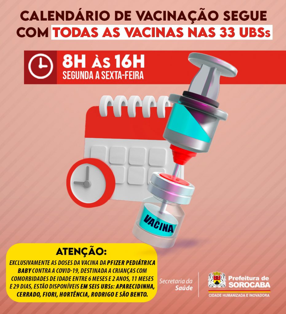 O Calendário Municipal de Vacinação segue atendendo a população com todas as vacinas disponíveis, nas 33 UBSs (Unidades Básicas de Saúde) da cidade de Sorocaba, das 8h às 16h, de segunda a sexta-feira.