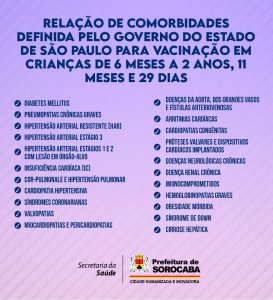 Dando sequência à imunização infantil, a Prefeitura de Sorocaba, por meio da Secretaria da Saúde (SES), vacina, a partir de segunda-feira (2), de forma gradativa, crianças de 6 meses a 2 anos, 11 meses e 29 dias, sem comorbidades, com doses da vacina da Pfizer Pediátrica Baby contra a Covid-19. A imunização ocorre no mesmo horário, em seis UBSs (Unidades Básicas de Saúde): Aparecidinha, Cerrado, Fiori, Hortência, Rodrigo e São Bento.