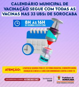 O Calendário Municipal de Vacinação segue atendendo a população com todas as vacinas disponíveis, nas 33 UBSs (Unidades Básicas de Saúde) da cidade de Sorocaba, das 8h às 16h, de segunda a sexta-feira.