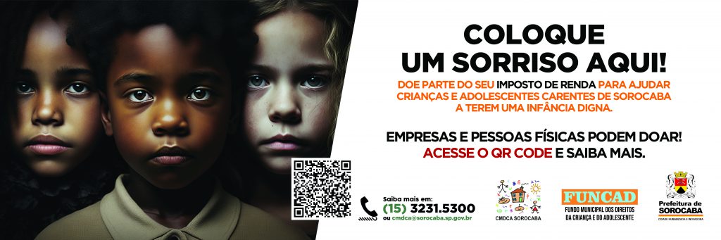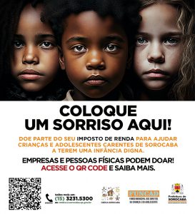 A Prefeitura de Sorocaba, por meio da Secretaria da Cidadania (Secid) e da Secretaria de Comunicação (Secom), em parceria com o Conselho Municipal dos Direitos da Criança e do Adolescente (CMDCA), lança a campanha “Coloque um Sorriso Aqui”, que está sendo divulgada em diferentes canais de comunicação da Prefeitura e também com o apoio da imprensa e de parceiros. O objetivo é incentivar a população a destinar parte do Imposto de Renda (IR) já devido a entidades assistenciais de Sorocaba que realizam trabalhos e desenvolvem projetos voltados a crianças e adolescentes em situação de vulnerabilidade social no município.