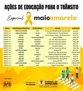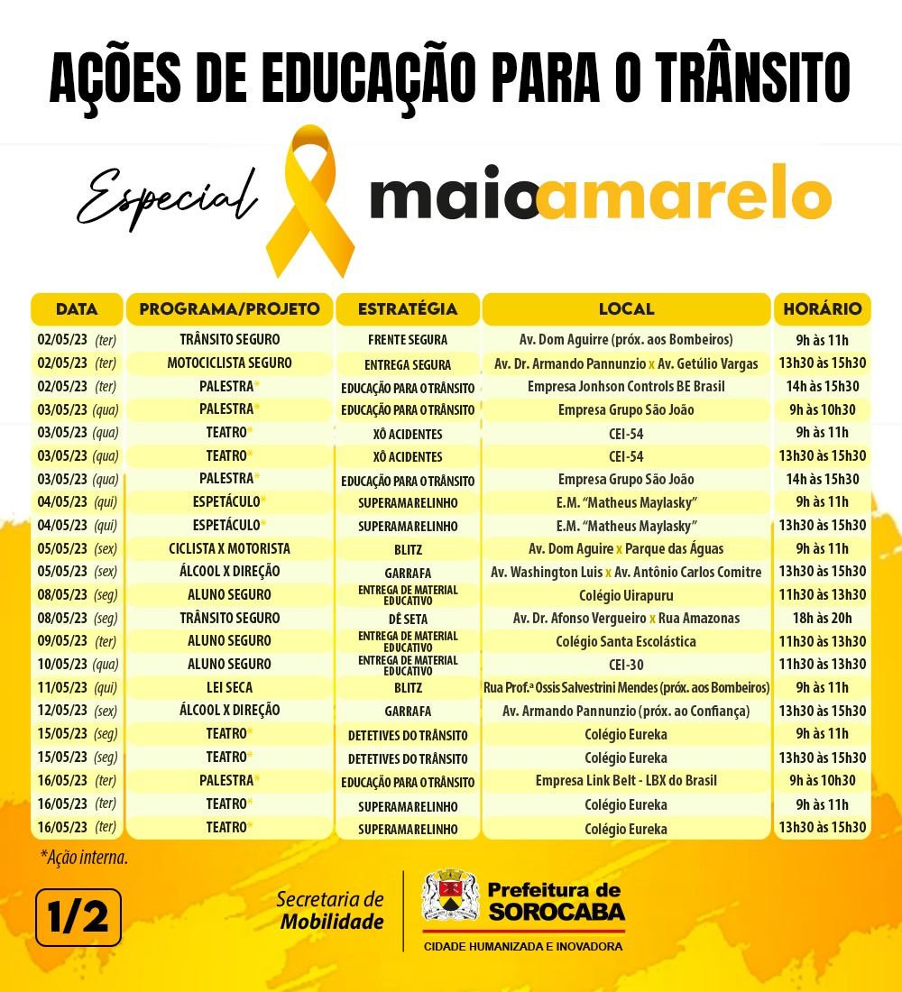 A Prefeitura de Sorocaba, por meio da Secretaria de Mobilidade (Semob), inicia, na próxima terça-feira (2), a campanha Maio Amarelo 2023, para conscientizar sobre prevenção a acidentes e segurança no trânsito. Neste ano, serão priorizadas as ações educativas, como teatros e palestras em escolas e empresas, incluídas na programação mensal. Ao todo, serão 39 atividades educativas, com 19 temáticas diferentes, três delas inéditas, inclusive em pontos estratégicos da cidade, para o público em geral.