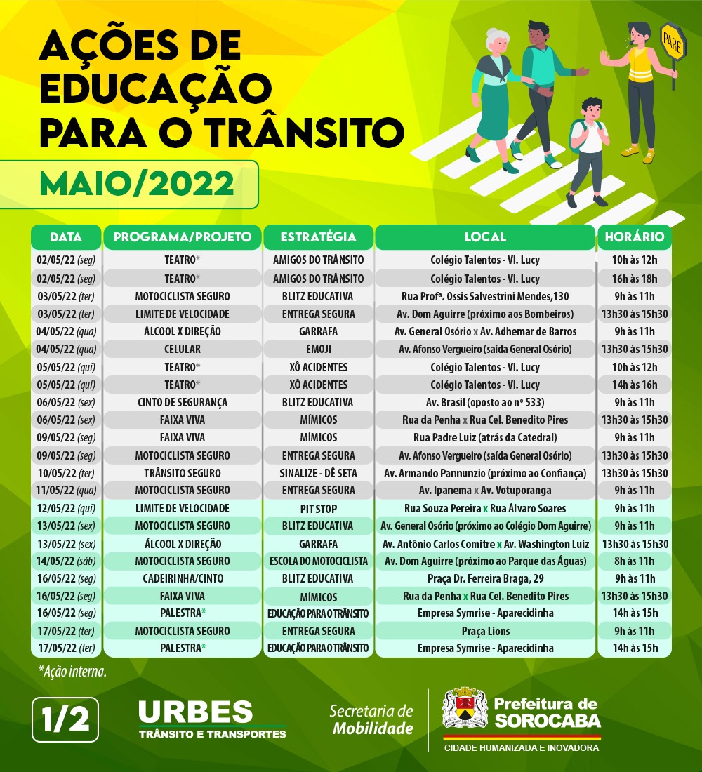 A Prefeitura de Sorocaba, por meio da Urbes – Trânsito e Transportes e Secretaria de Mobilidade (Semob), chega à última semana de atividades educativas da Campanha “Maio Amarelo”, de conscientização sobre segurança no trânsito e prevenção contra acidentes. Ao todo, são 45 ações ao longo do mês, das quais 13 programadas para esta reta final, de 23 a 30 de maio, em diferentes pontos da cidade.