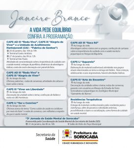 As unidades CAPS AD III “Roda Viva” e CAPS III “Alegria de Viver” realizarão, ainda, semanalmente, oficinas, palestras, rodas de conversas, atividades de cultura e lazer, abordando a temática do Janeiro Branco, incluindo palestras e oficinas para os colaboradores das unidades.