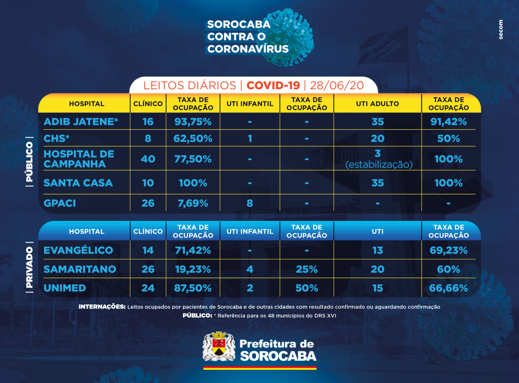 A Prefeitura de Sorocaba, por meio da Secretaria da Saúde (SES), registrou mais duas novas mortes confirmadas com o novo coronavírus, neste domingo (28). Já os casos confirmados com a doença passaram de 4.095 para 4.116 na cidade. Os óbitos com a confirmação da doença aumentaram para 117.